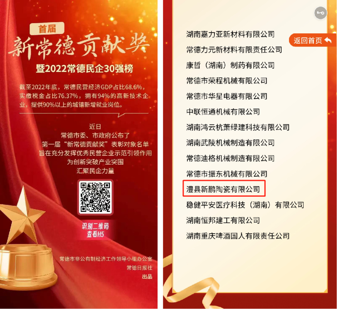 近日,以湖南省常德市委市政府名義表彰的第一屆“新常德貢獻(xiàn)獎”獲獎名單發(fā)布。其中,廣東東鵬控股股份有限公司旗下“澧縣新鵬陶瓷有限公司”(以下簡稱“東鵬湖南基地”)被授予“新常德貢獻(xiàn)獎”先進(jìn)集體榮譽稱號,并入選2022常德民營企業(yè)30強。這是繼今年榮獲澧縣首屆縣長質(zhì)量獎后,東鵬湖南基地的又一項殊榮。