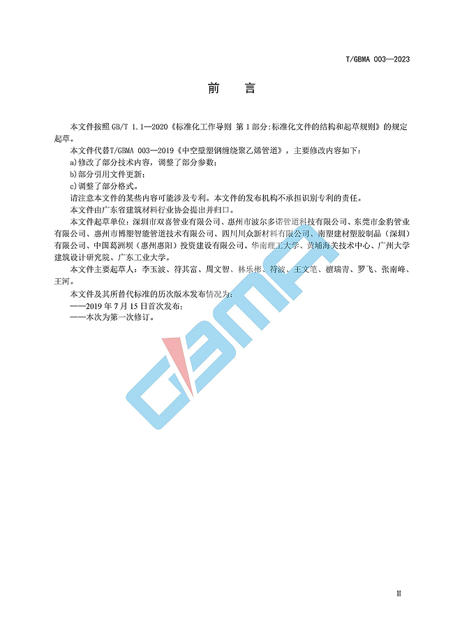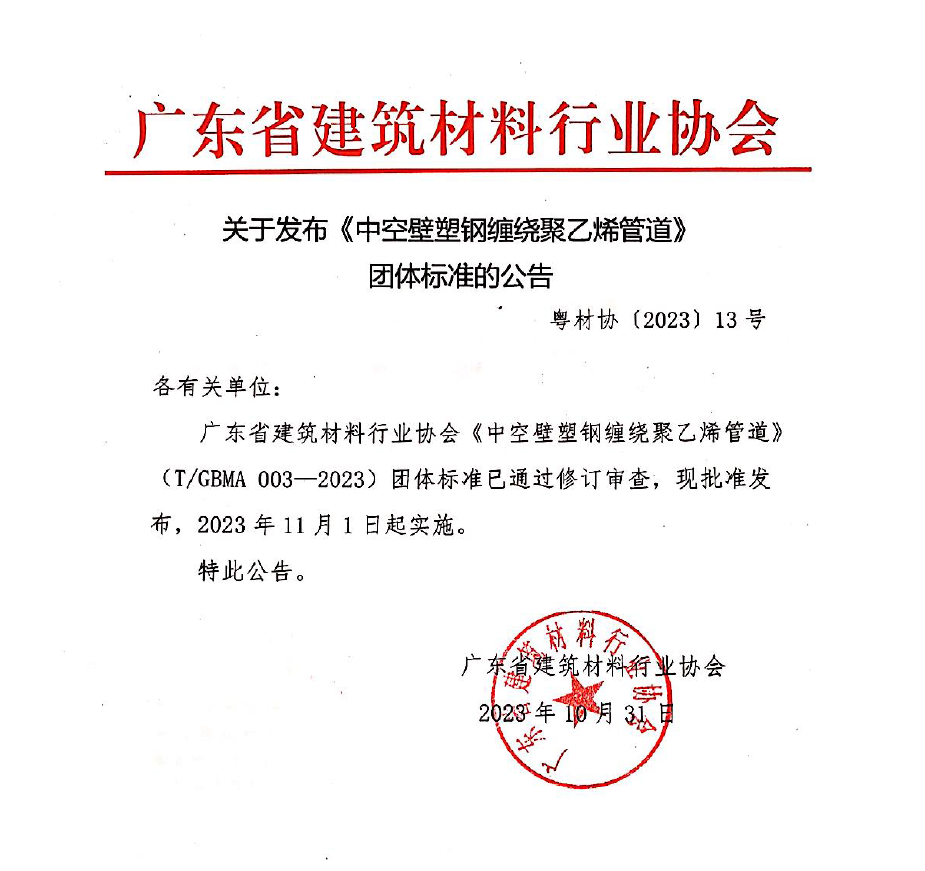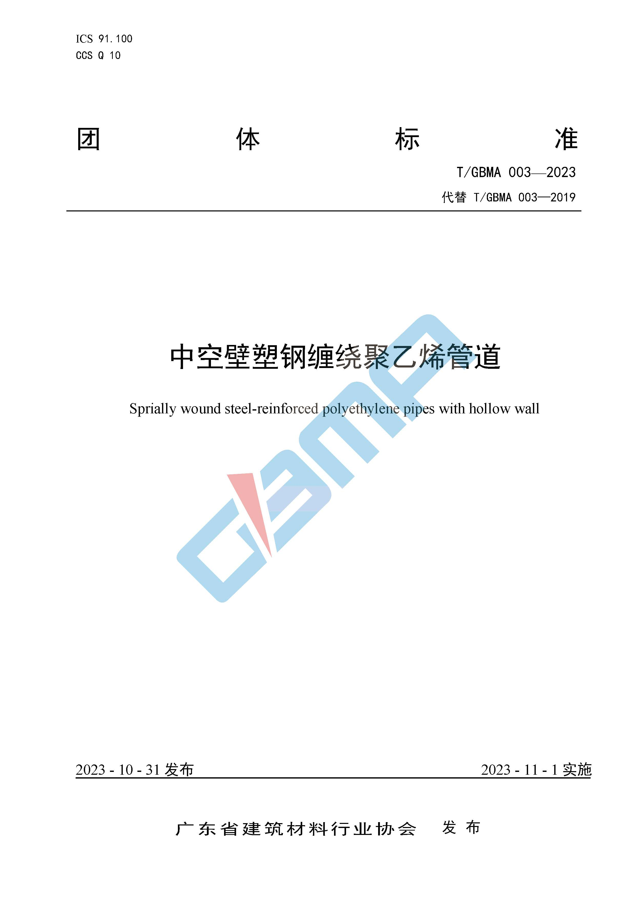 廣東省建筑材料行業(yè)協(xié)會《中空壁塑鋼纏繞聚乙烯管道》(T/GBMA 003—2023)團(tuán)體標(biāo)準(zhǔn)已通過修訂審查,現(xiàn)批準(zhǔn)發(fā)布,2023年11月1日起實(shí)施。