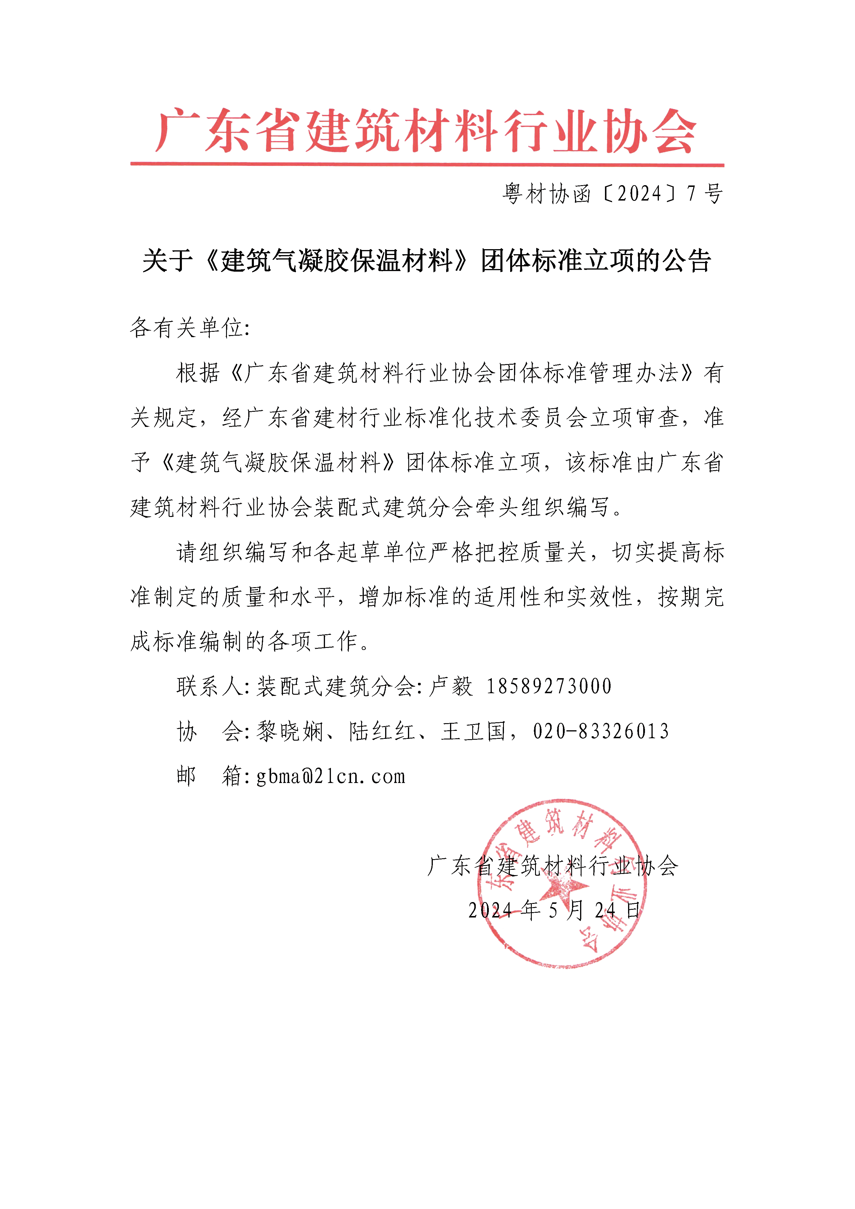 根據(jù)《廣東省建筑材料行業(yè)協(xié)會團(tuán)體標(biāo)準(zhǔn)管理辦法》有關(guān)規(guī)定,經(jīng)廣東省建材行業(yè)標(biāo)準(zhǔn)化技術(shù)委員會立項審查,準(zhǔn)予《建筑氣凝膠保溫材料》團(tuán)體標(biāo)準(zhǔn)立項,該標(biāo)準(zhǔn)由廣東省建筑材料行業(yè)協(xié)會裝配式建筑分會牽頭組織編寫。
