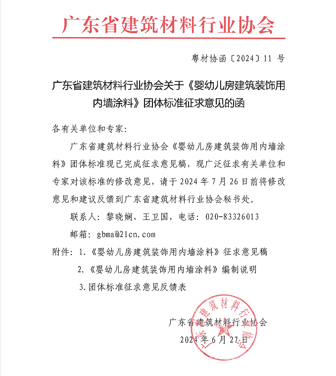 廣東省建筑材料行業(yè)協(xié)會《嬰幼兒房建筑裝飾用內(nèi)墻涂料》團(tuán)體標(biāo)準(zhǔn)現(xiàn)已完成征求意見稿,現(xiàn)廣泛征求有關(guān)單位和專家對該標(biāo)準(zhǔn)的修改意見,請于2024年7月26日前將修改意見和建議反饋到廣東省建筑材料行業(yè)協(xié)會秘書處。