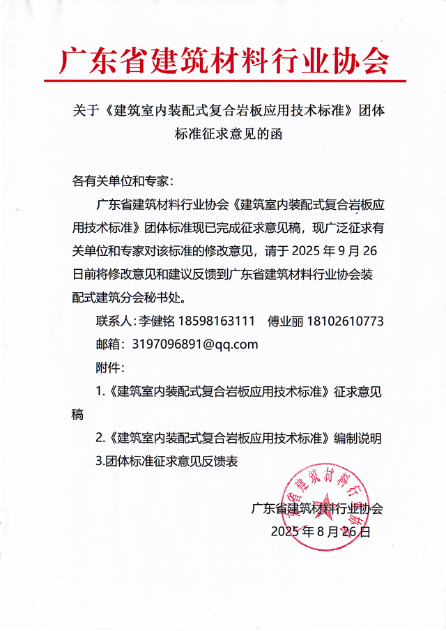 廣東省建筑材料行業(yè)協(xié)會《建筑室內(nèi)裝配式復合巖板應用技術標準》團體標準現(xiàn)已完成征求意見稿,現(xiàn)廣泛征求有關單位和專家對該標準的修改意見,請于2025年9月26日前將修改意見和建議反饋到廣東省建筑材料行業(yè)協(xié)會裝配式建筑分會秘書處。