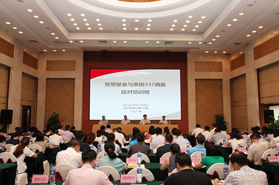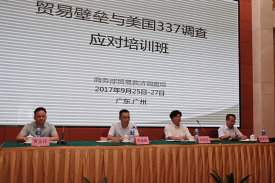 9月25日至27日,商務部貿(mào)易救濟調(diào)查局在廣州舉辦“2017年度貿(mào)易壁壘與美國337調(diào)查應對培訓班”。商務部貿(mào)易救濟調(diào)查局劉丹陽副局長出席開班儀式并介紹貿(mào)易壁壘總體形勢和應對工作情況,廣東省商務廳公平貿(mào)易局李勇毅局長出席并致辭,商務部貿(mào)易救濟局陳貴華處長主持會議。全國各省(市、自治區(qū))、我省各地級市商務主管部門、重點行業(yè)協(xié)(商)會代表、重點外貿(mào)企業(yè)等120余人參加培訓,廣東省建筑材料行業(yè)協(xié)會主管公平貿(mào)易工作的負責人參加了培訓。
