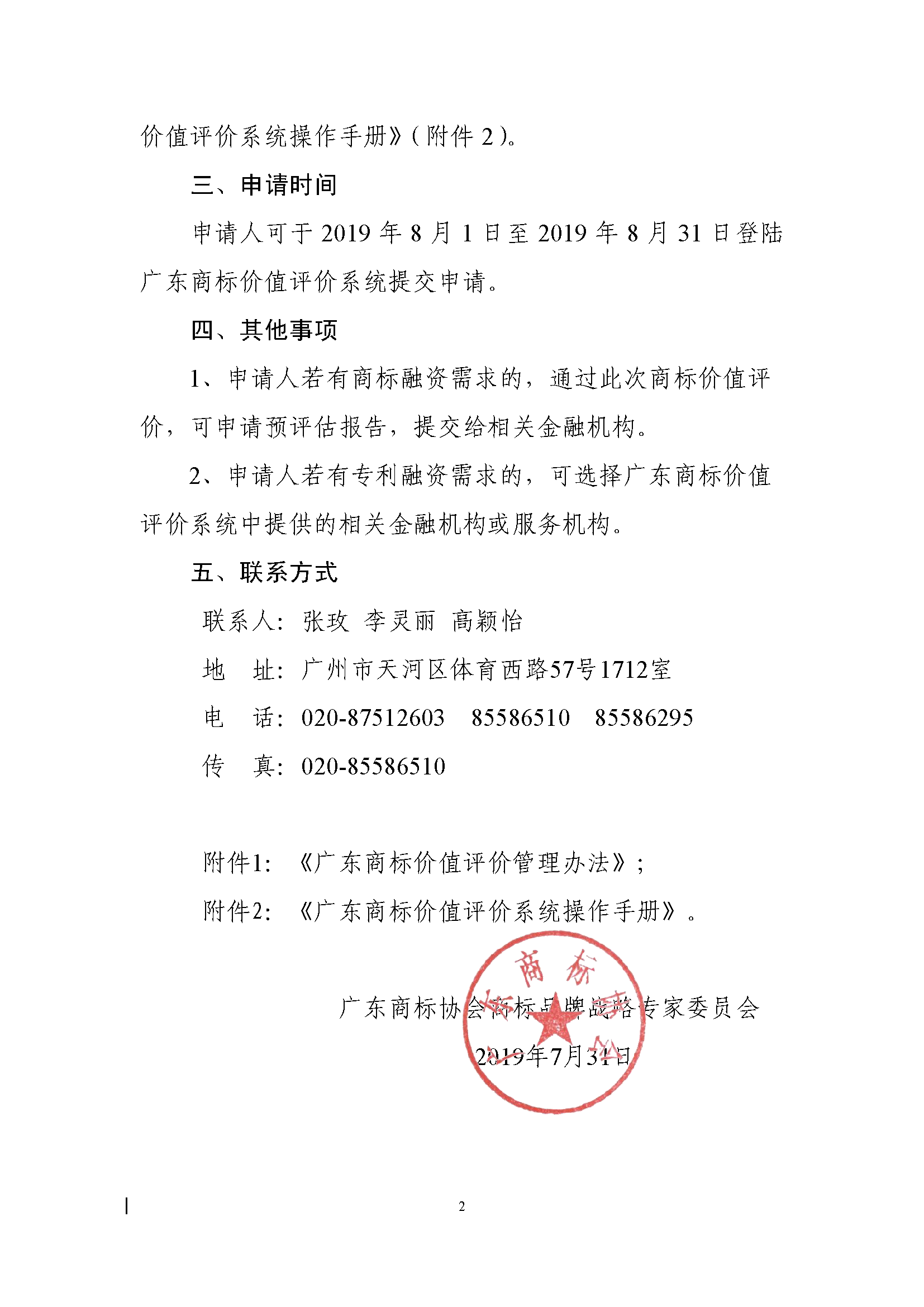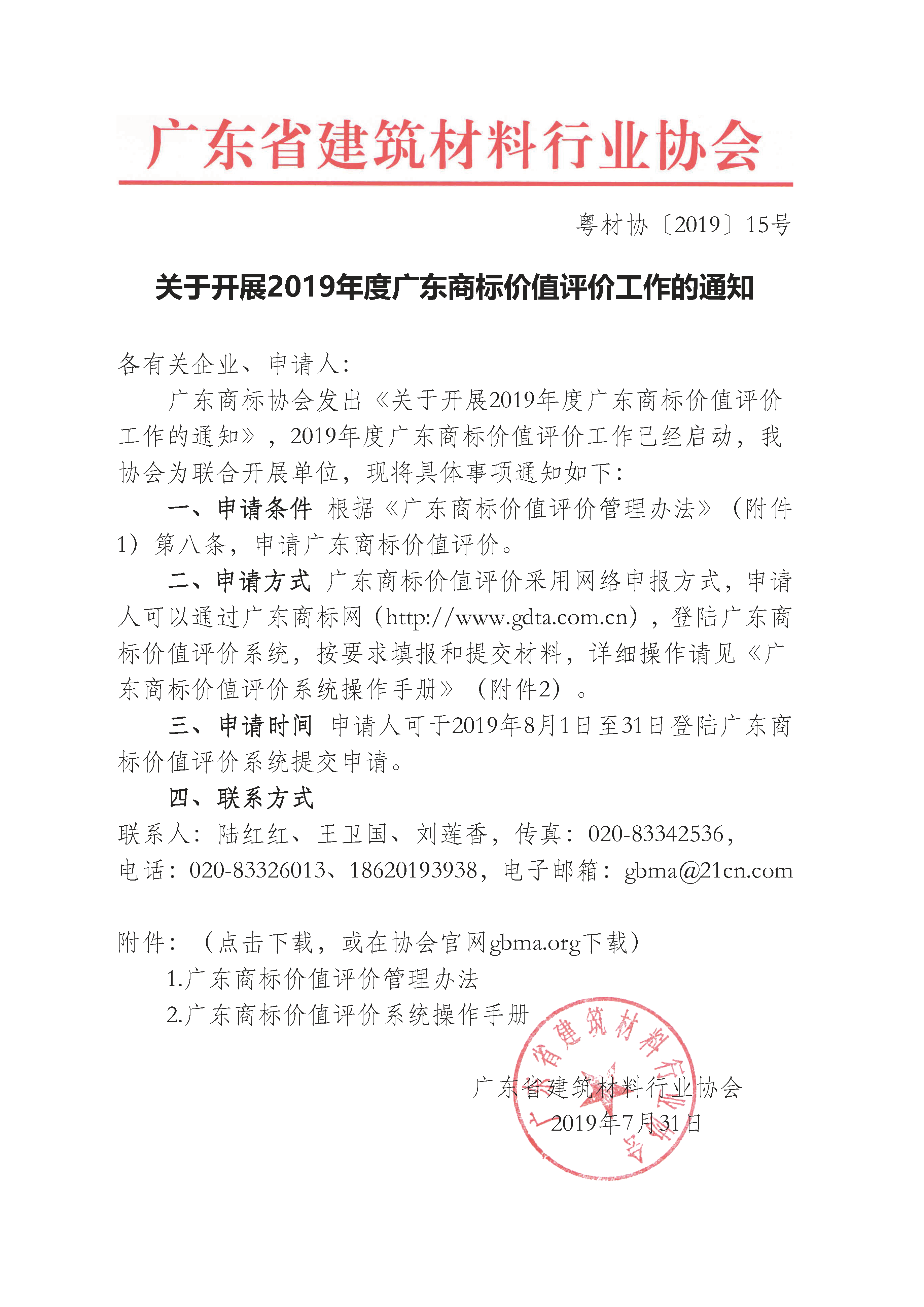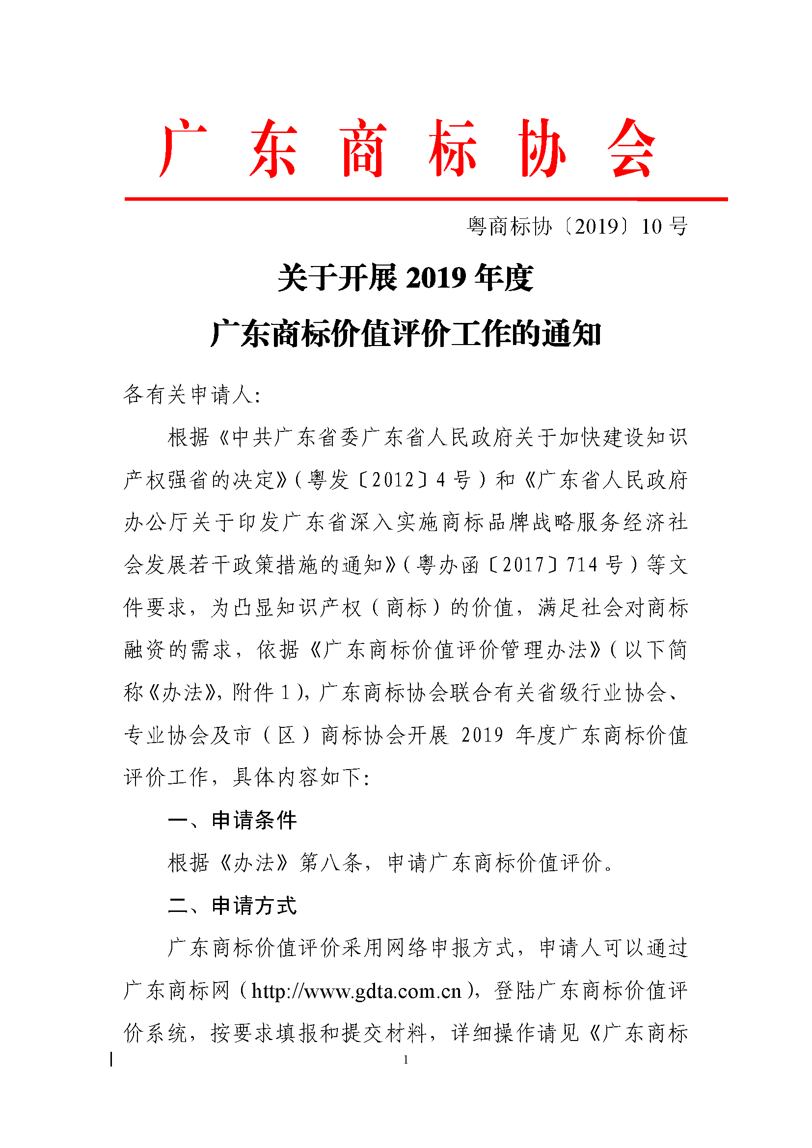 廣東商標(biāo)協(xié)會(huì)發(fā)出《關(guān)于開展2019年度廣東商標(biāo)價(jià)值評(píng)價(jià)工作的通知》,2019年度廣東商標(biāo)價(jià)值評(píng)價(jià)工作已經(jīng)啟動(dòng),我協(xié)會(huì)為聯(lián)合開展單位,現(xiàn)將具體事項(xiàng)通知如下: