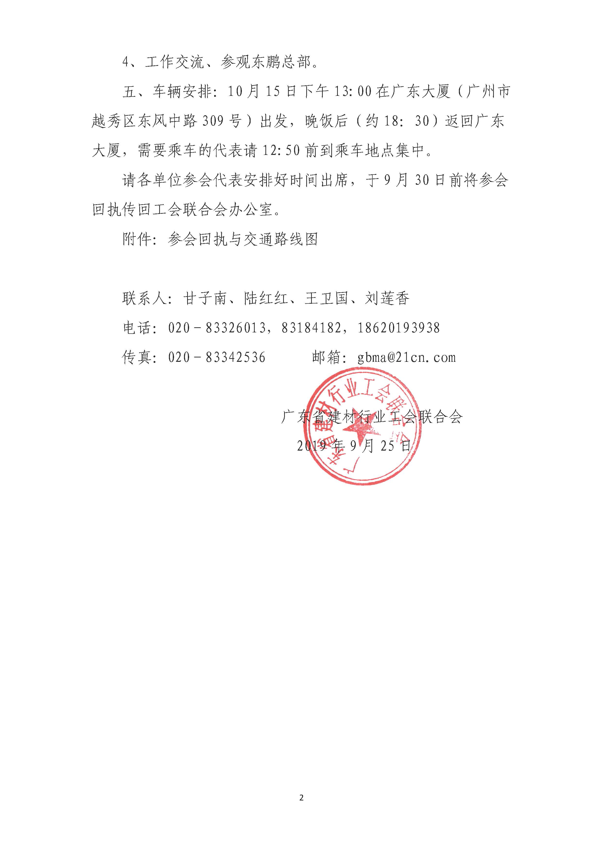 五、車輛安排:10月15日下午13:00在廣東大廈(廣州市越秀區(qū)東風(fēng)中路309號)出發(fā),晚飯后(約18:30)返回廣東大廈,需要乘車的代表請12:50前到乘車地點(diǎn)集中。