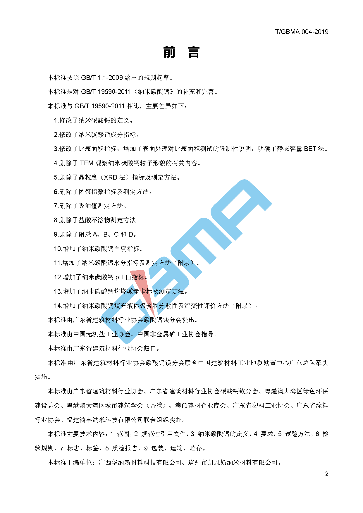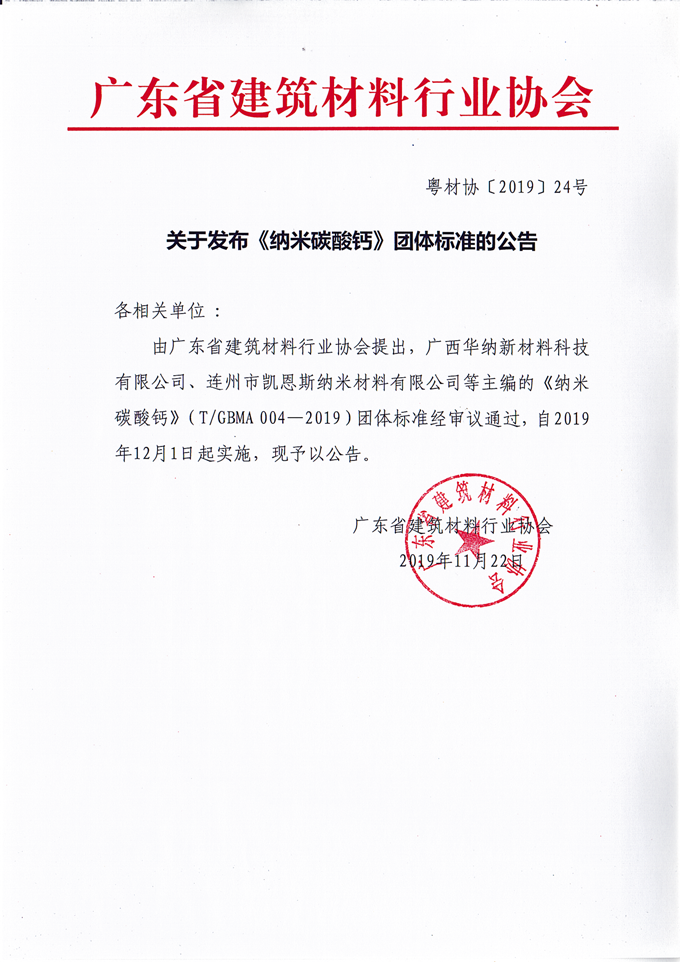 由廣東省建筑材料行業(yè)協(xié)會提出,廣西華納新材料科技有限公司、連州市凱恩斯納米材料有限公司等主編的《納米碳酸鈣》(T/GBMA 004—2019)團體標準經(jīng)審議通過,自2019年12月1日起實施,現(xiàn)予以公告。