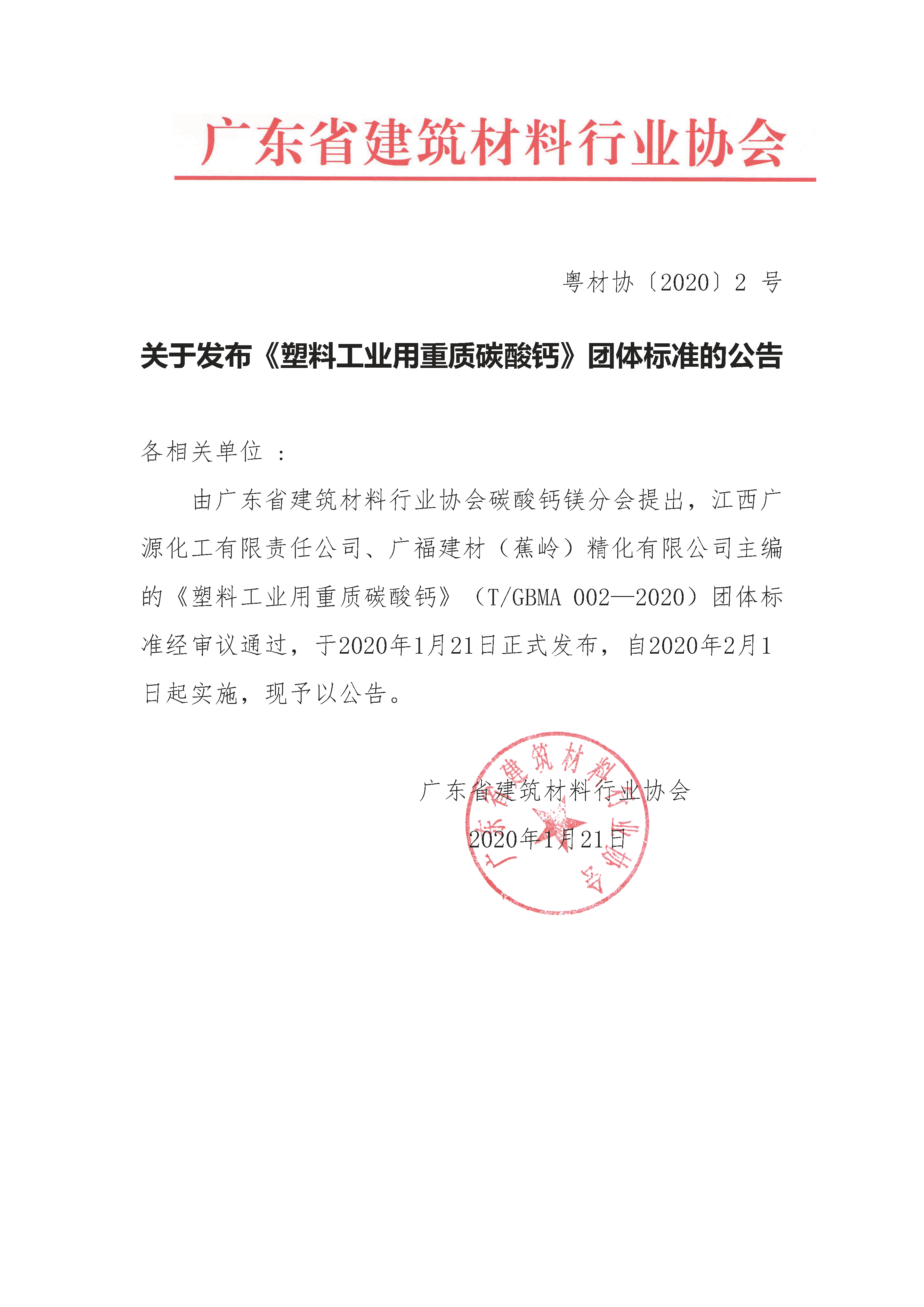 關(guān)于發(fā)布《塑料工業(yè)用重質(zhì)碳酸鈣》團(tuán)體標(biāo)準(zhǔn)的公告
